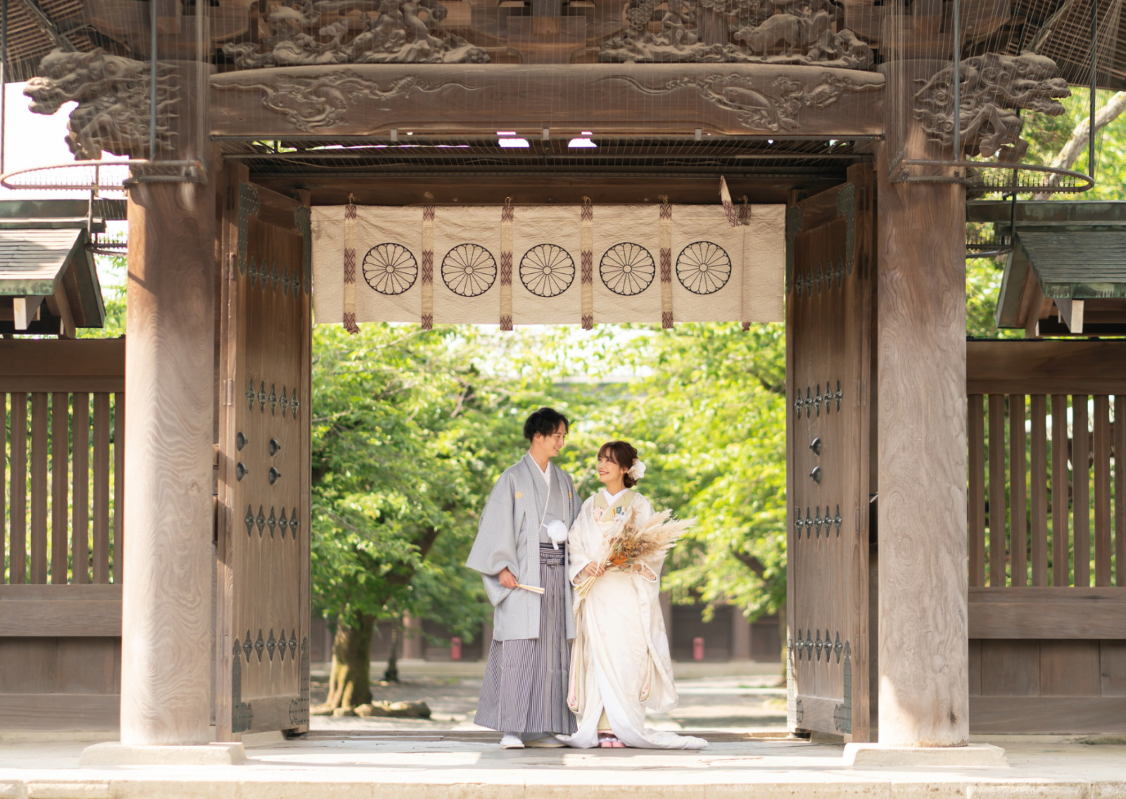神前式では、新郎は紋付袴、新婦は白無垢や色打掛といった伝統的な和装を着用します。特に、日本庭園や歴史ある神社での和装姿は美しく、写真映えするのも魅力の一つです。
