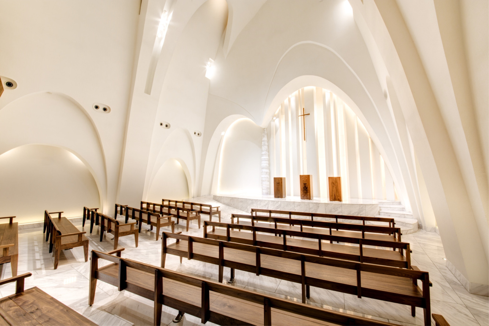 館内チャペル「ソルミエ」は、光に包まれた神秘的な空間。親族だけの結婚式でも感動的な挙式が実現します。天候に左右されないため、安心して大切な日を迎えられるのも魅力です。