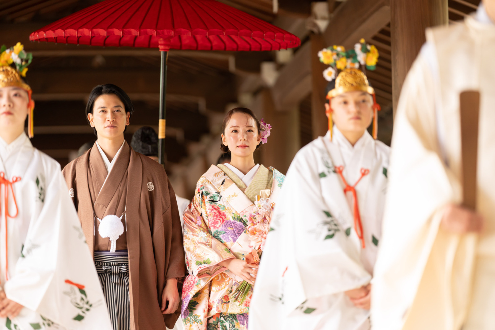 雅楽の音色とともに、新郎新婦とご親族が境内をゆっくりと進みます。この光景はまさに日本の伝統美そのもの。
