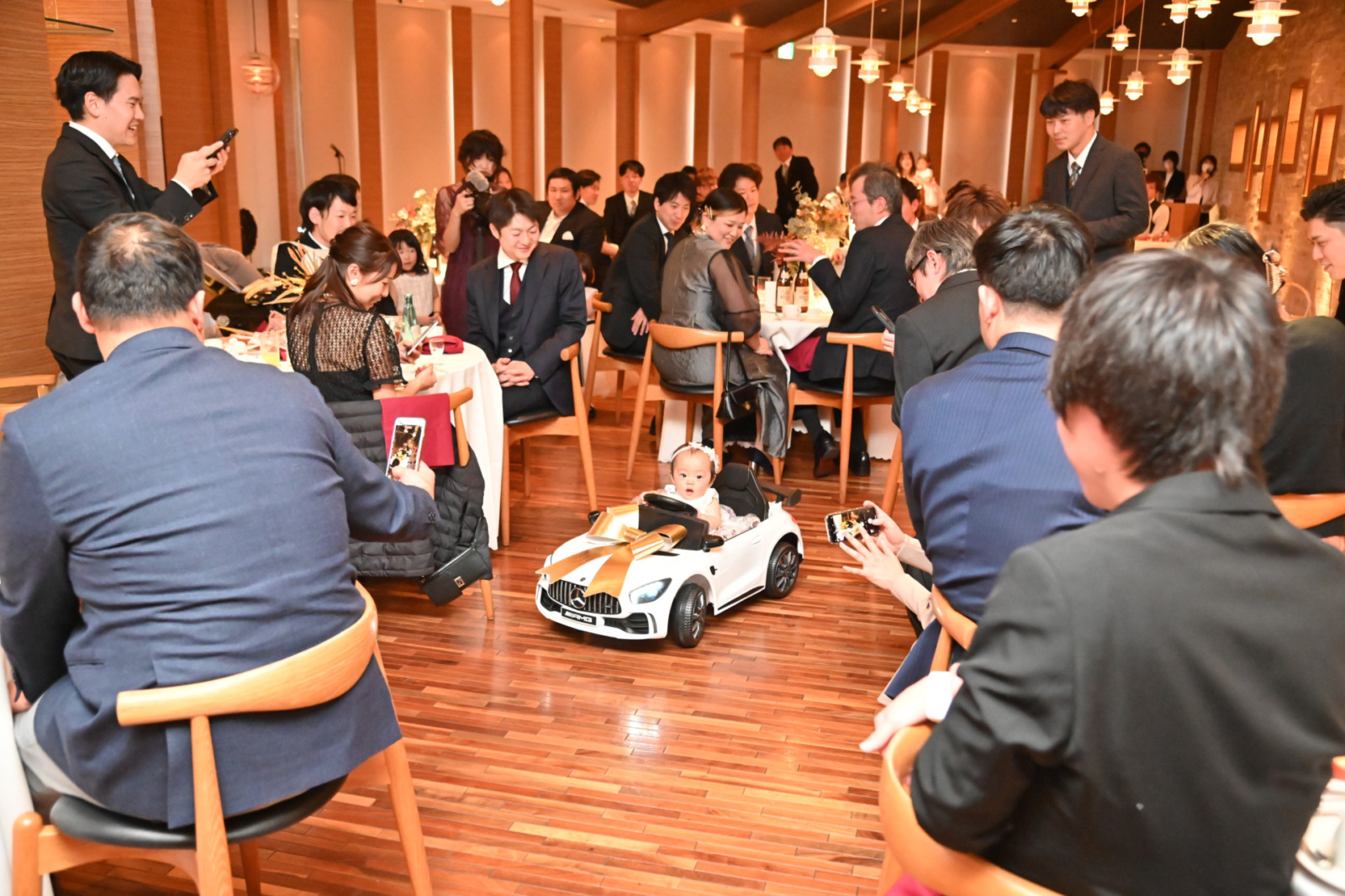 お色直し入場では、お子さんがミニベンツに乗って登場!