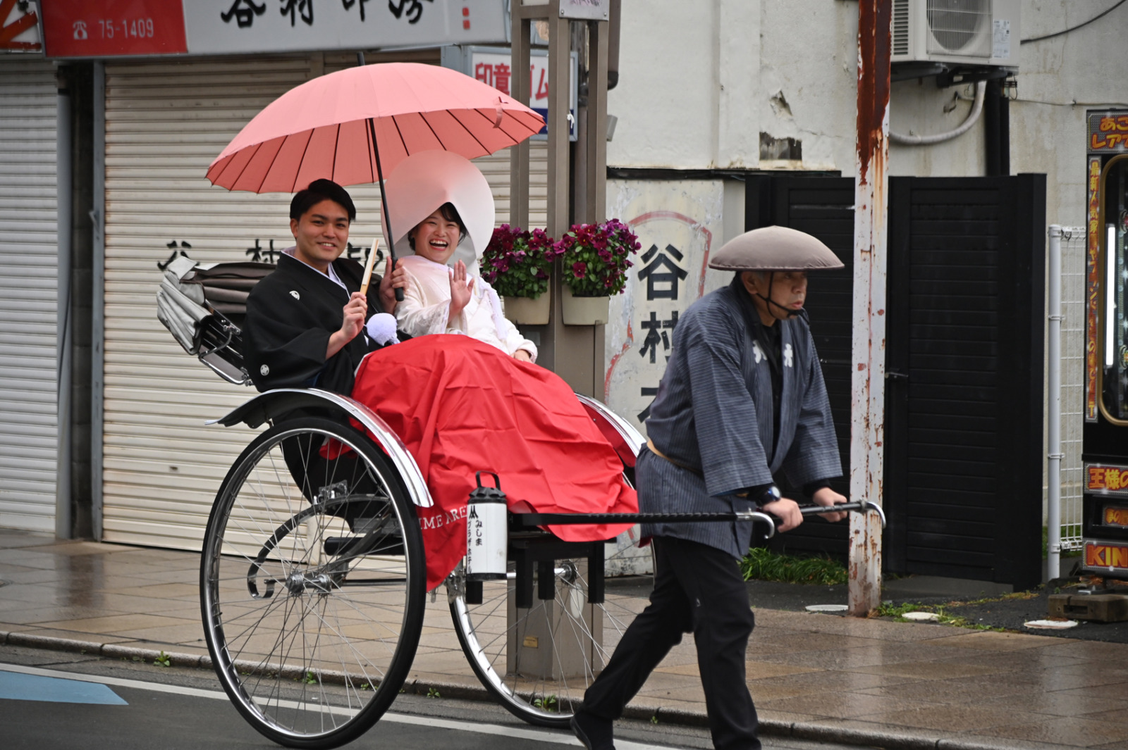 人力車で出発するおふたりの姿はまるで映画のワンシーンのようで、