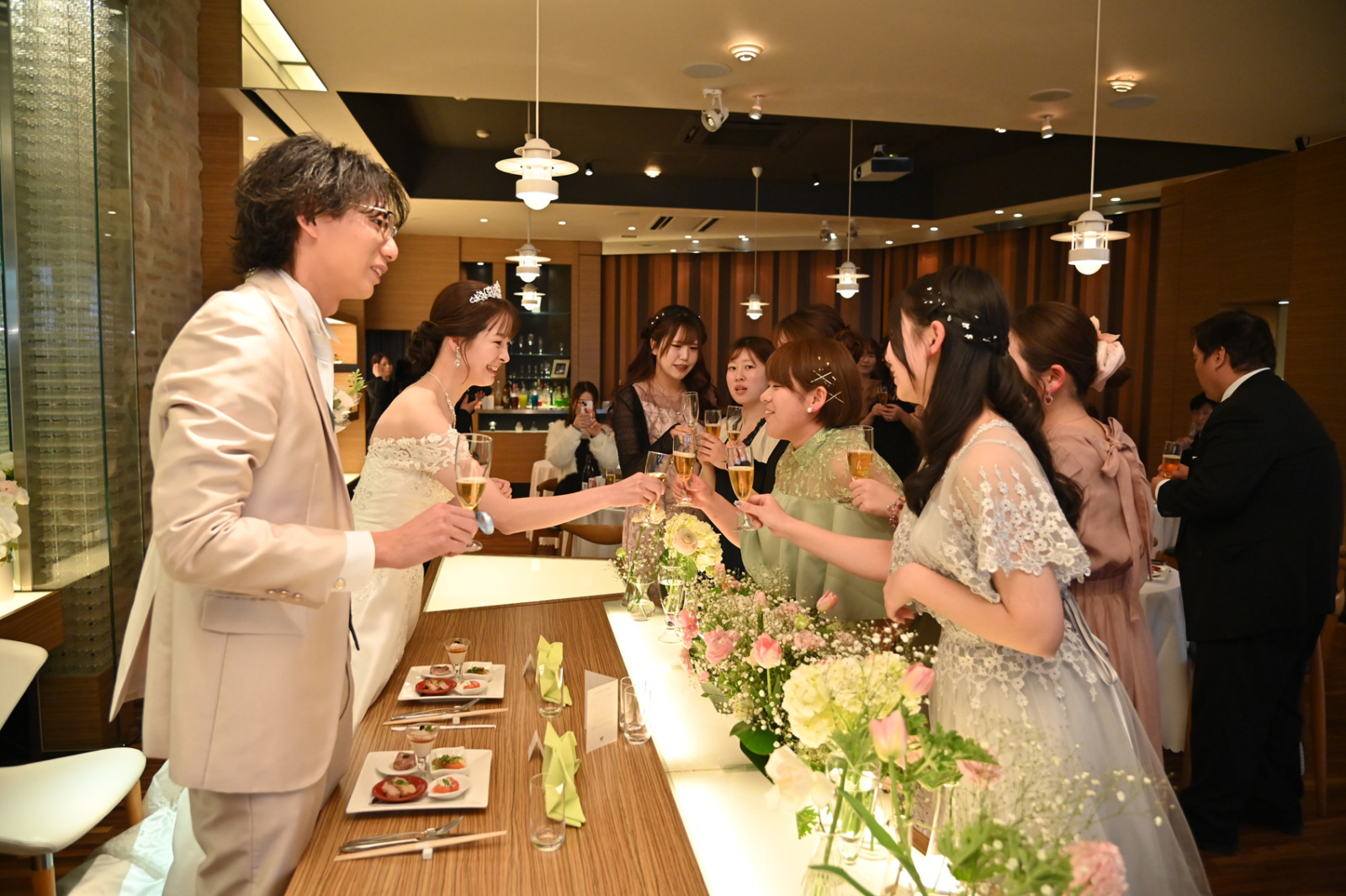 祝宴のスタートは、乾杯とともにゲストが次々とおふたりの席まで駆け寄り、笑顔と祝福の言葉を直接届ける和やかなひととき。