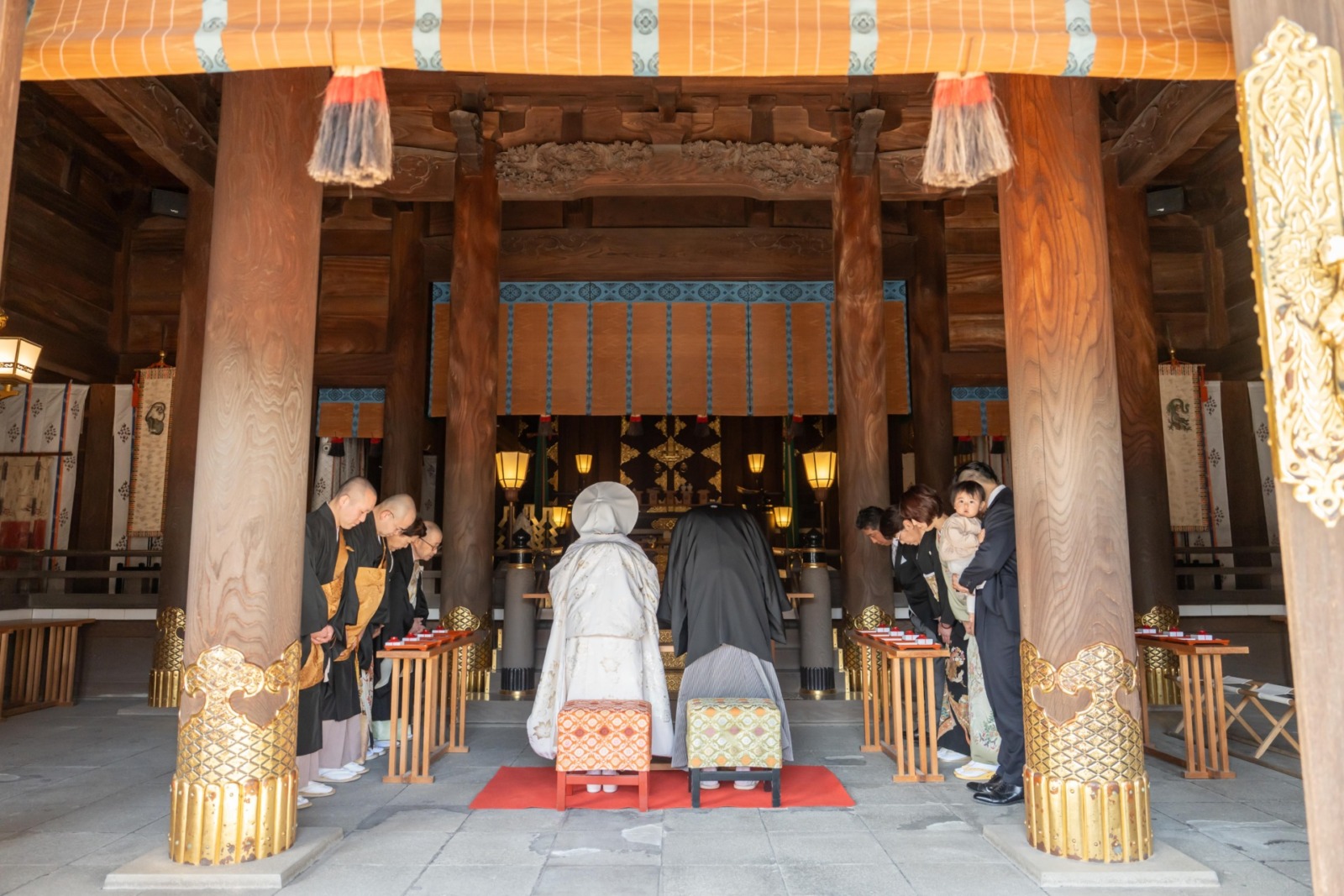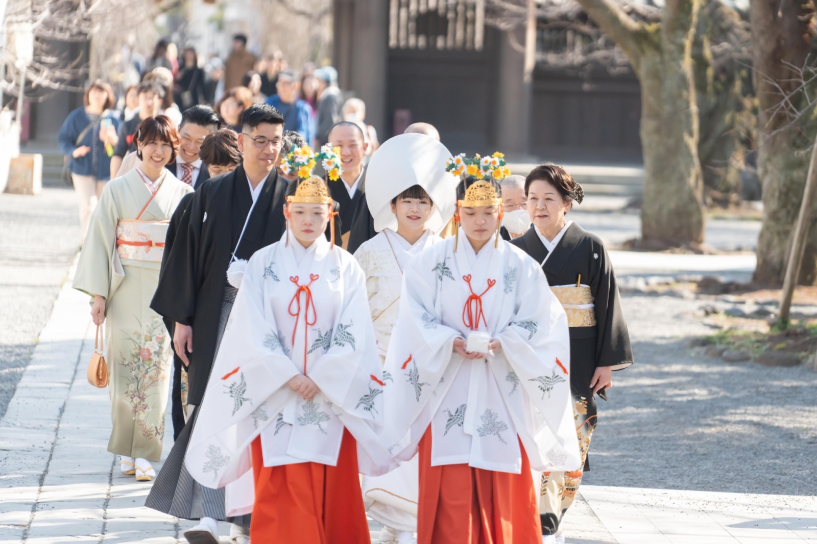 厳かな神前式の後には、春の陽ざしの中で笑顔あふれるおふたりの姿が印象的でした。