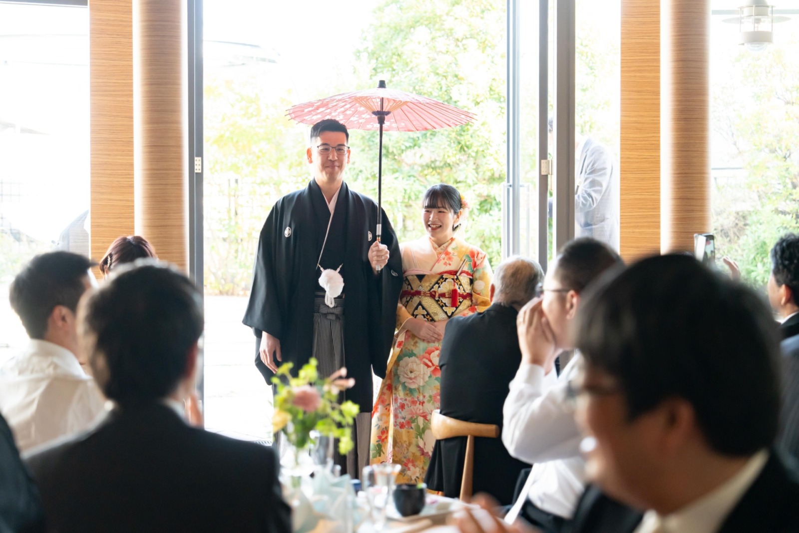 華やかな色打掛姿でガーデンから入場されたおふたりに、会場中から歓声と拍手が沸き起こりました。