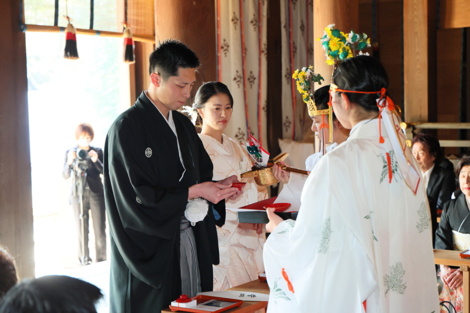 三嶋大社にて厳かに執り行われたおふたりの挙式。