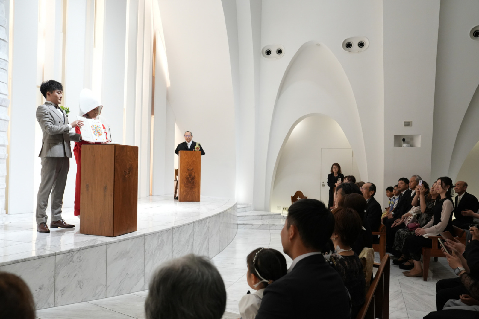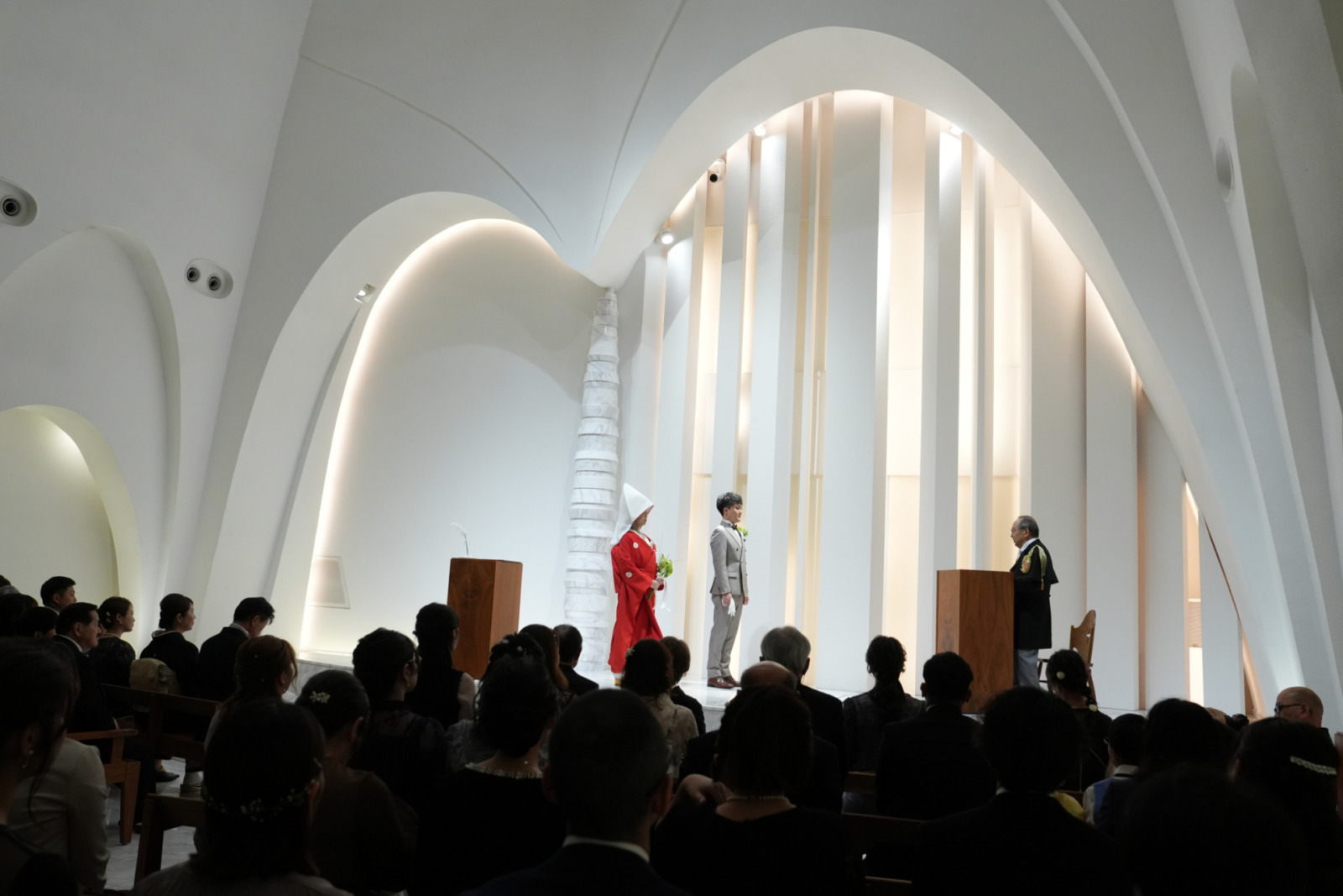 凛とした赤無垢がチャペルの光に映え、