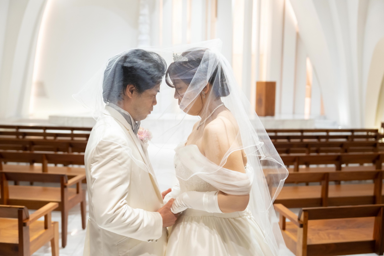 迎えた挙式は、光に包まれるチャペル「ソルミエ」でのキリスト教式。