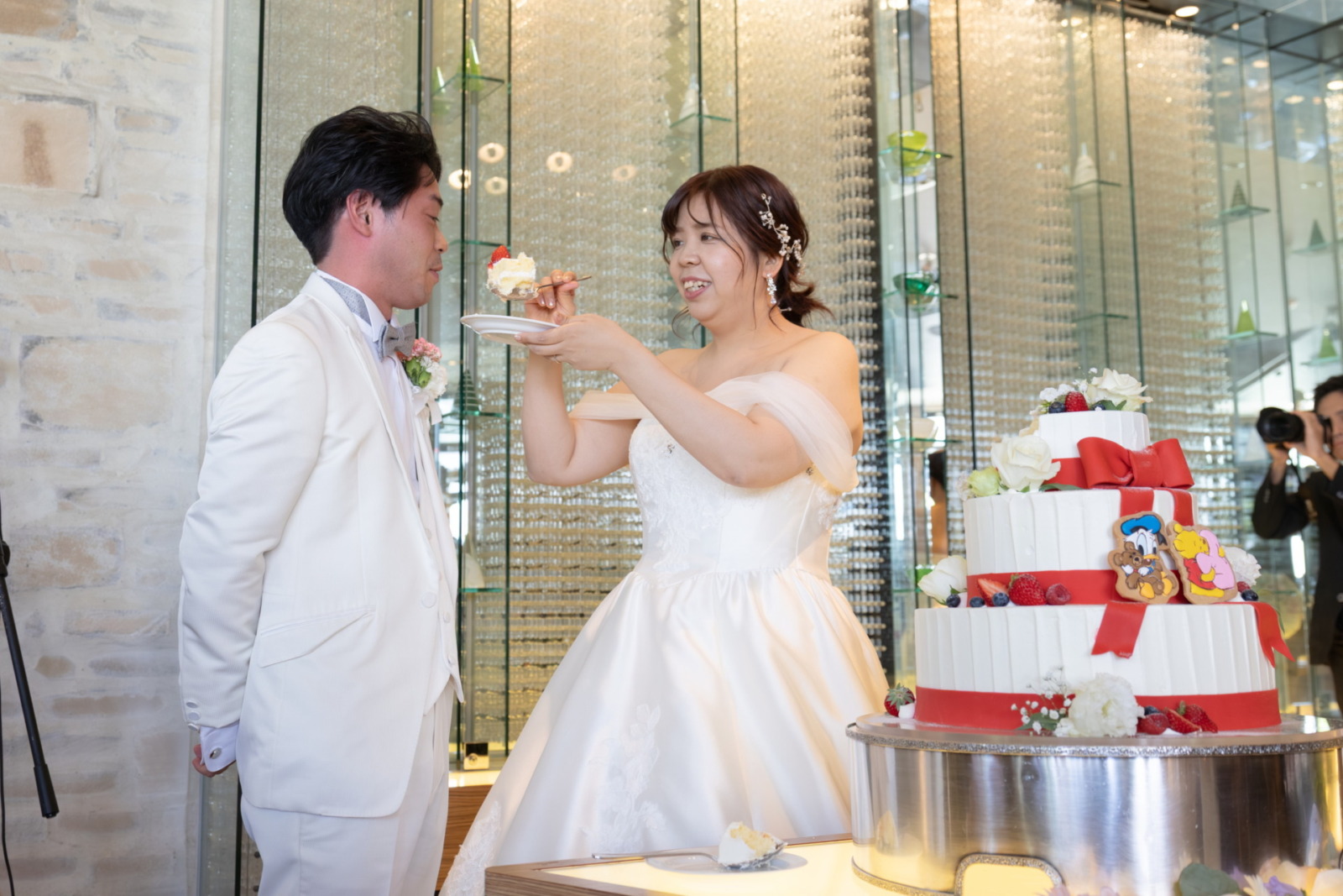 続いては、リボンをあしらった可愛らしい3段のオリジナルケーキに入刀。